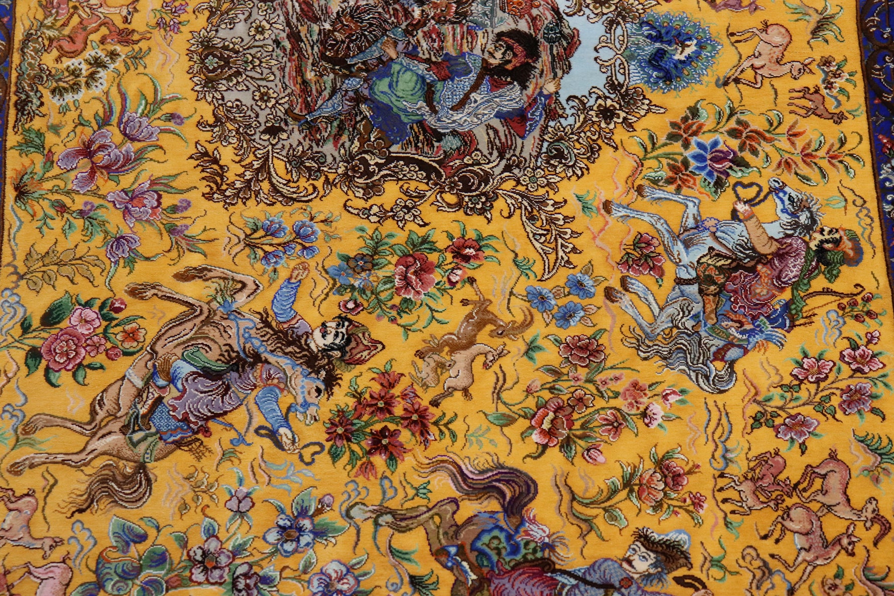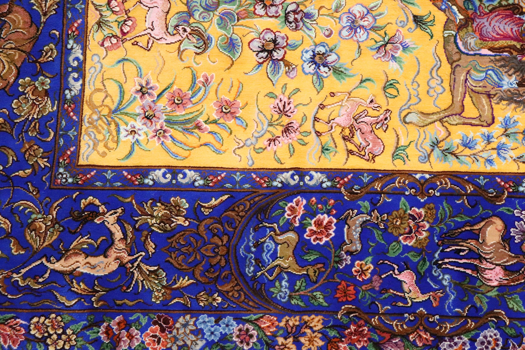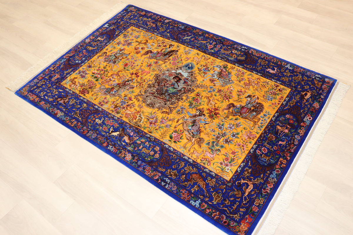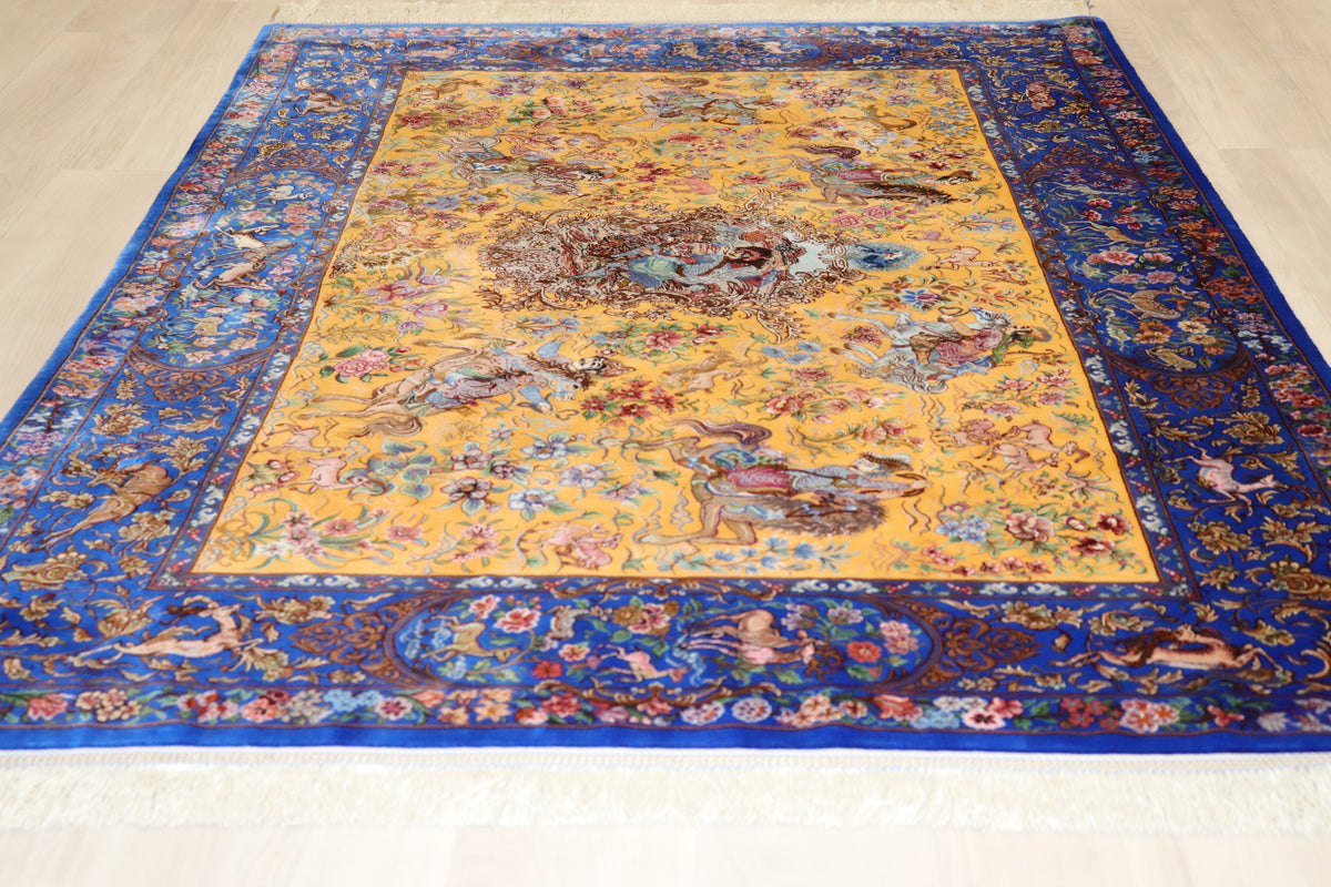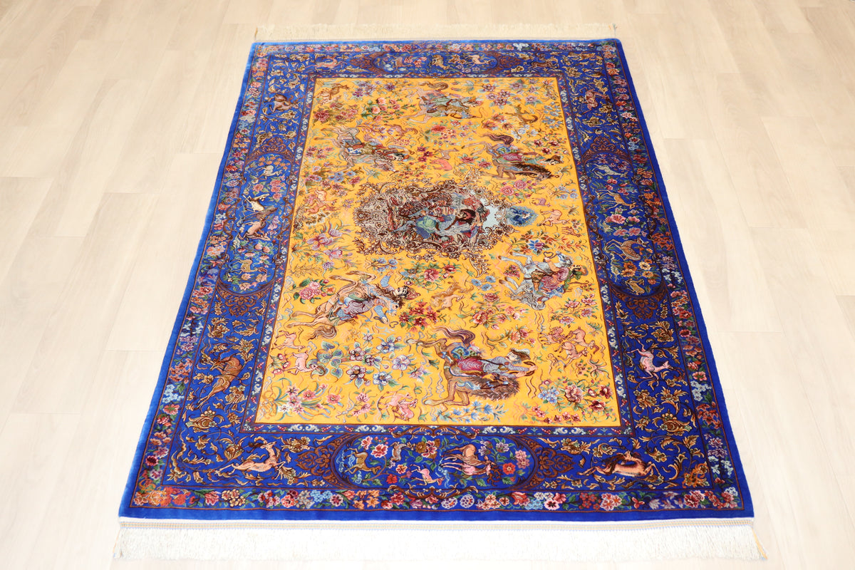1平方メートルあたり約120万ノットという驚異的な高密度織りにより、騎馬人物の凛々しい表情、逃げ惑う鹿やガゼルの筋肉の動き、着衣の繊細な紋様に至るまでが克明に表現されています。 それはもはや敷物という枠を超え、ペルシャの伝統工芸「細密画(ミニアチュール)」そのもの。最高級シルクの光沢が加わることで、見る角度によって勇壮な物語が立体的に浮かび上がります。