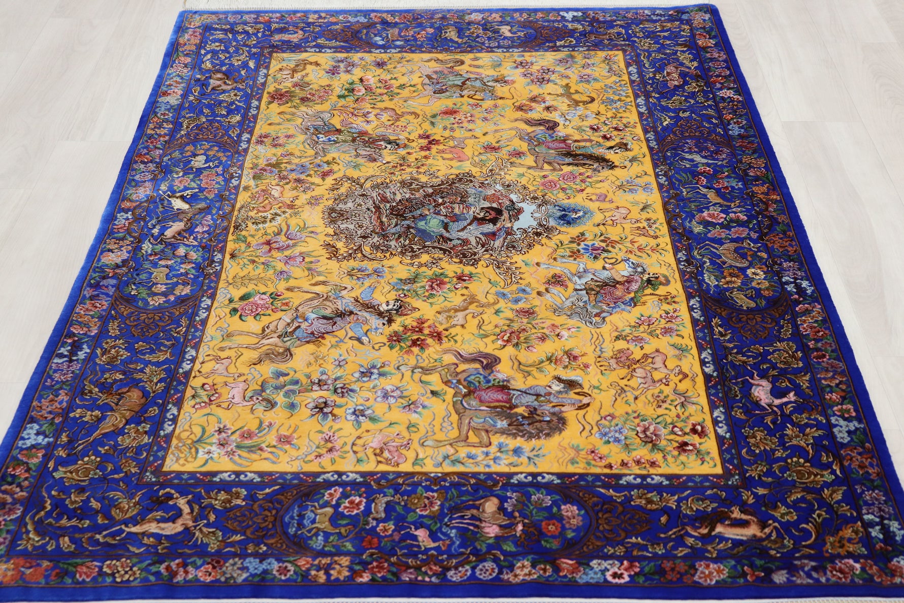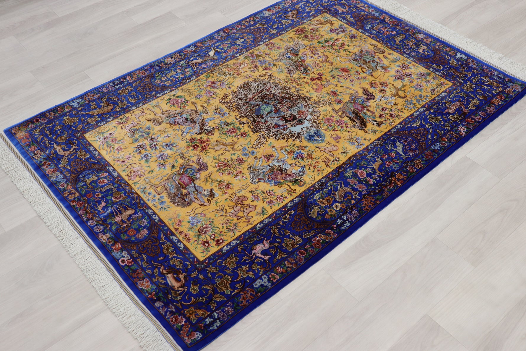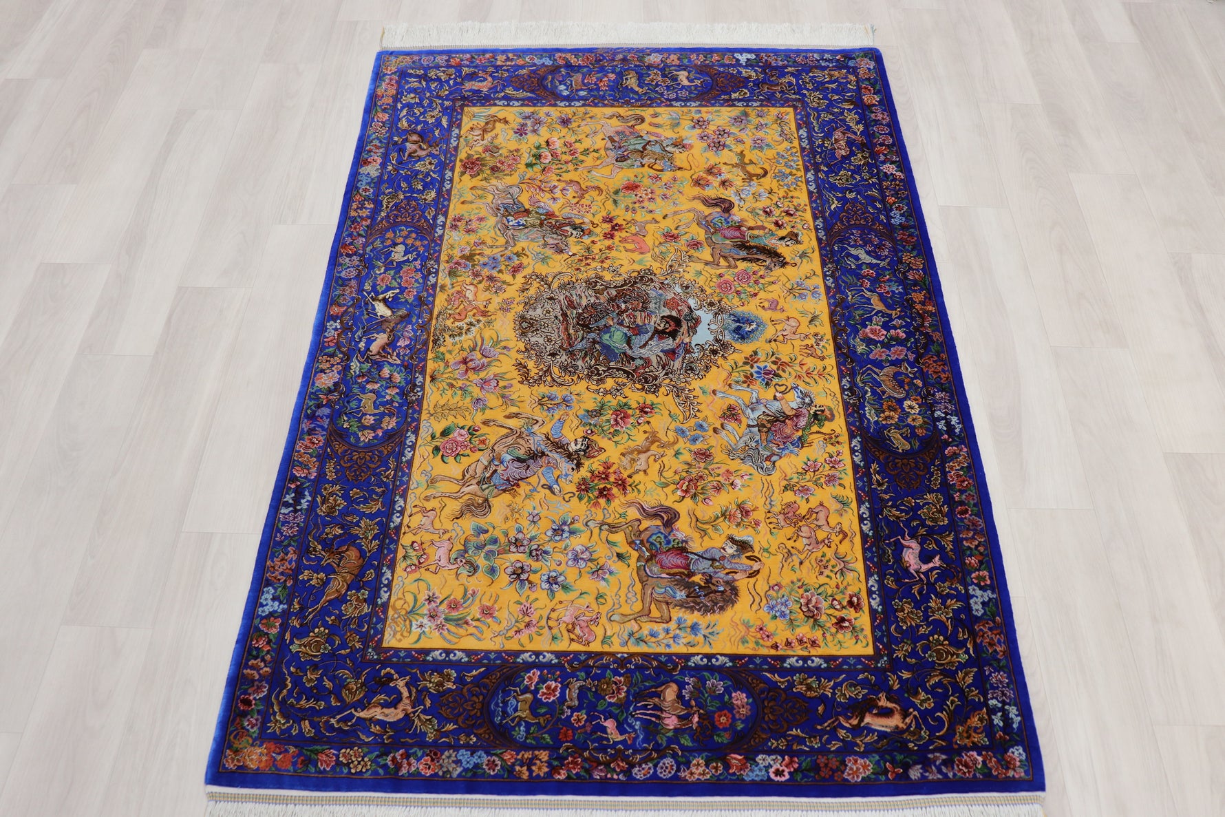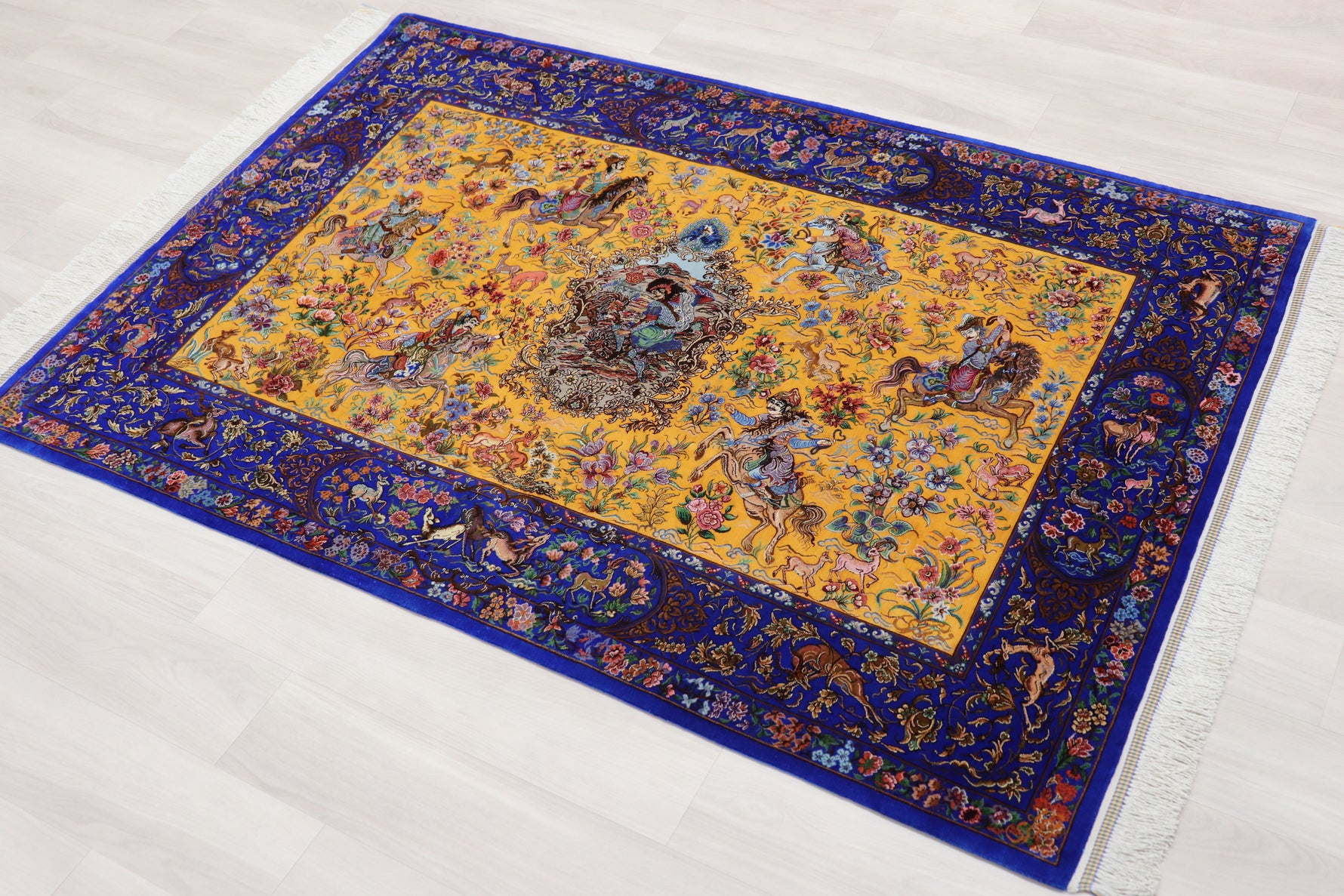 1平方メートルあたり約120万ノットという驚異的な高密度織りにより、騎馬人物の凛々しい表情、逃げ惑う鹿やガゼルの筋肉の動き、着衣の繊細な紋様に至るまでが克明に表現されています。 それはもはや敷物という枠を超え、ペルシャの伝統工芸「細密画(ミニアチュール)」そのもの。最高級シルクの光沢が加わることで、見る角度によって勇壮な物語が立体的に浮かび上がります。