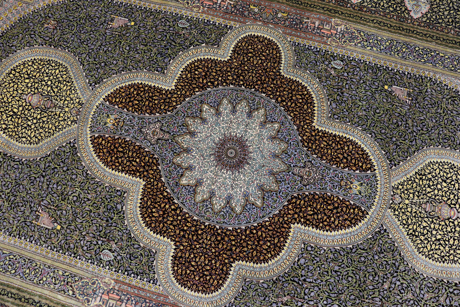 クム産シルクの巨匠ジャムシディ工房の中でも、独創的な色彩感覚で知られる、驚異的な密度の傑作です。