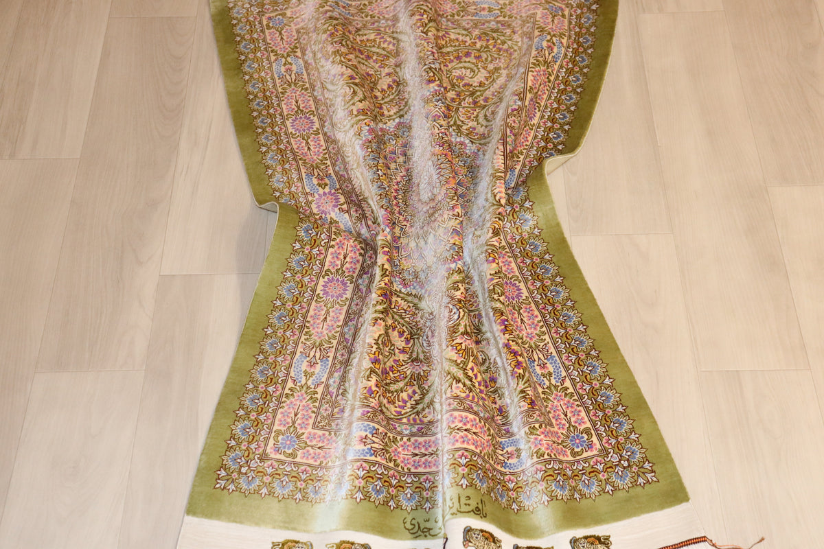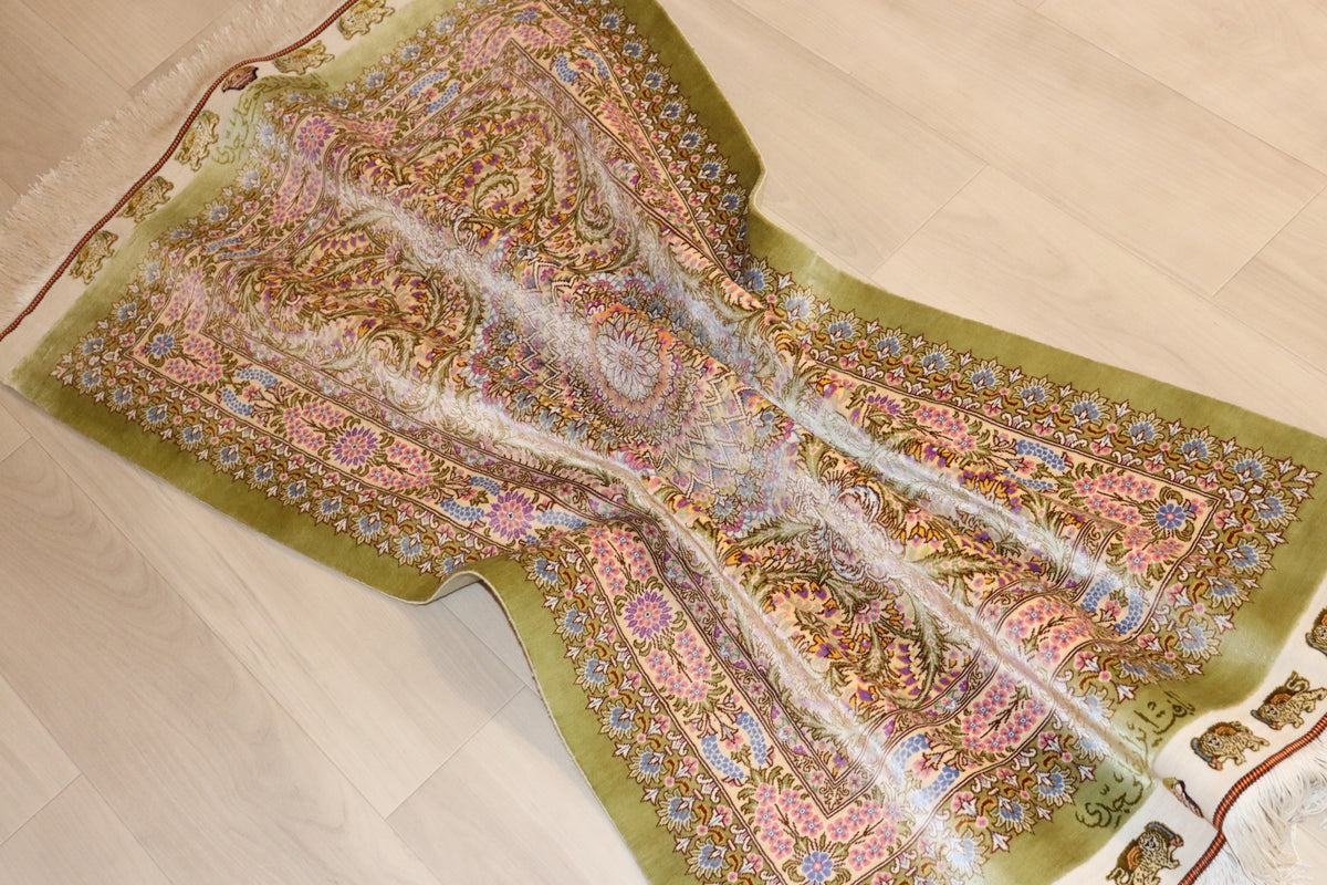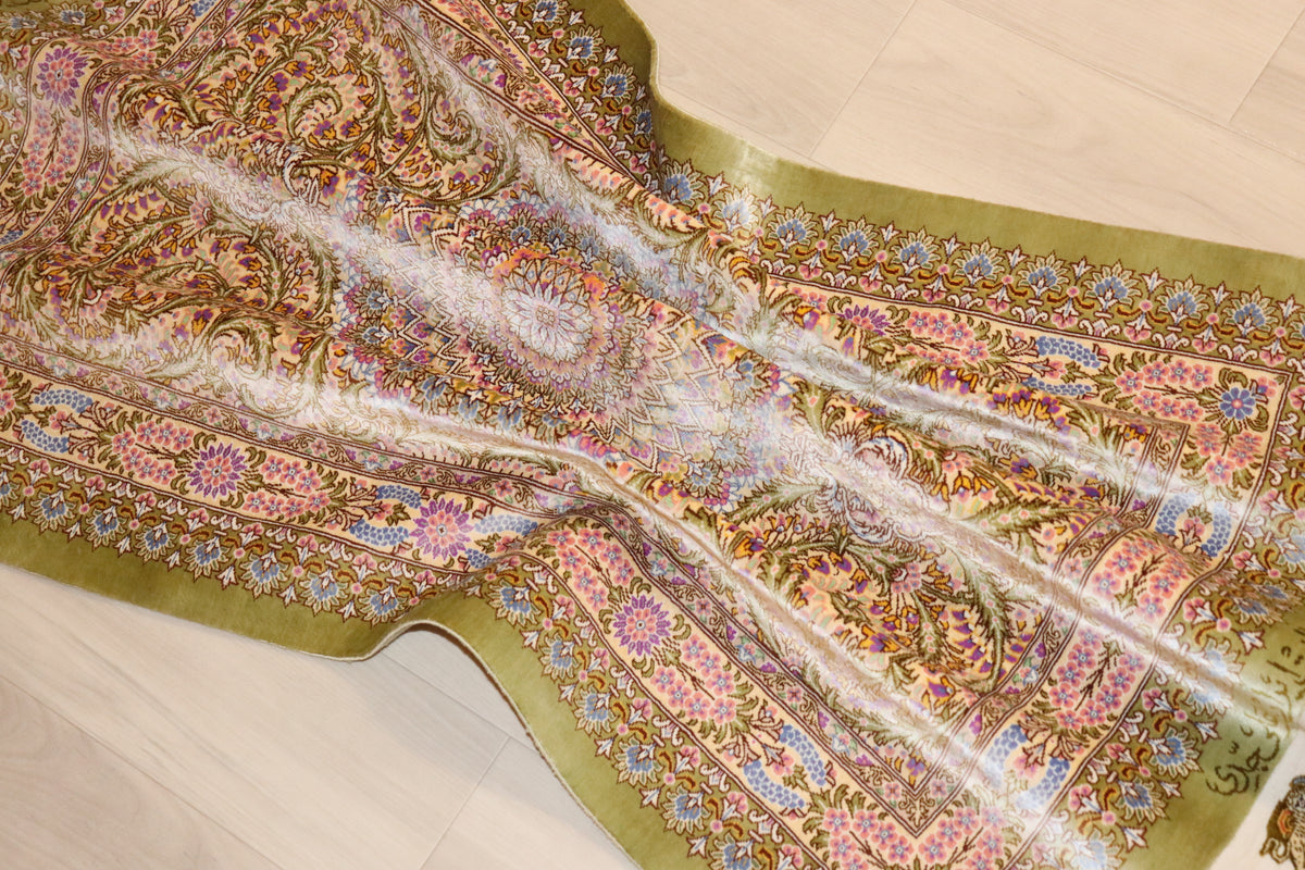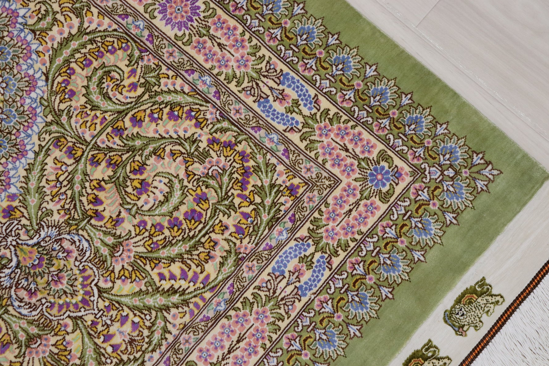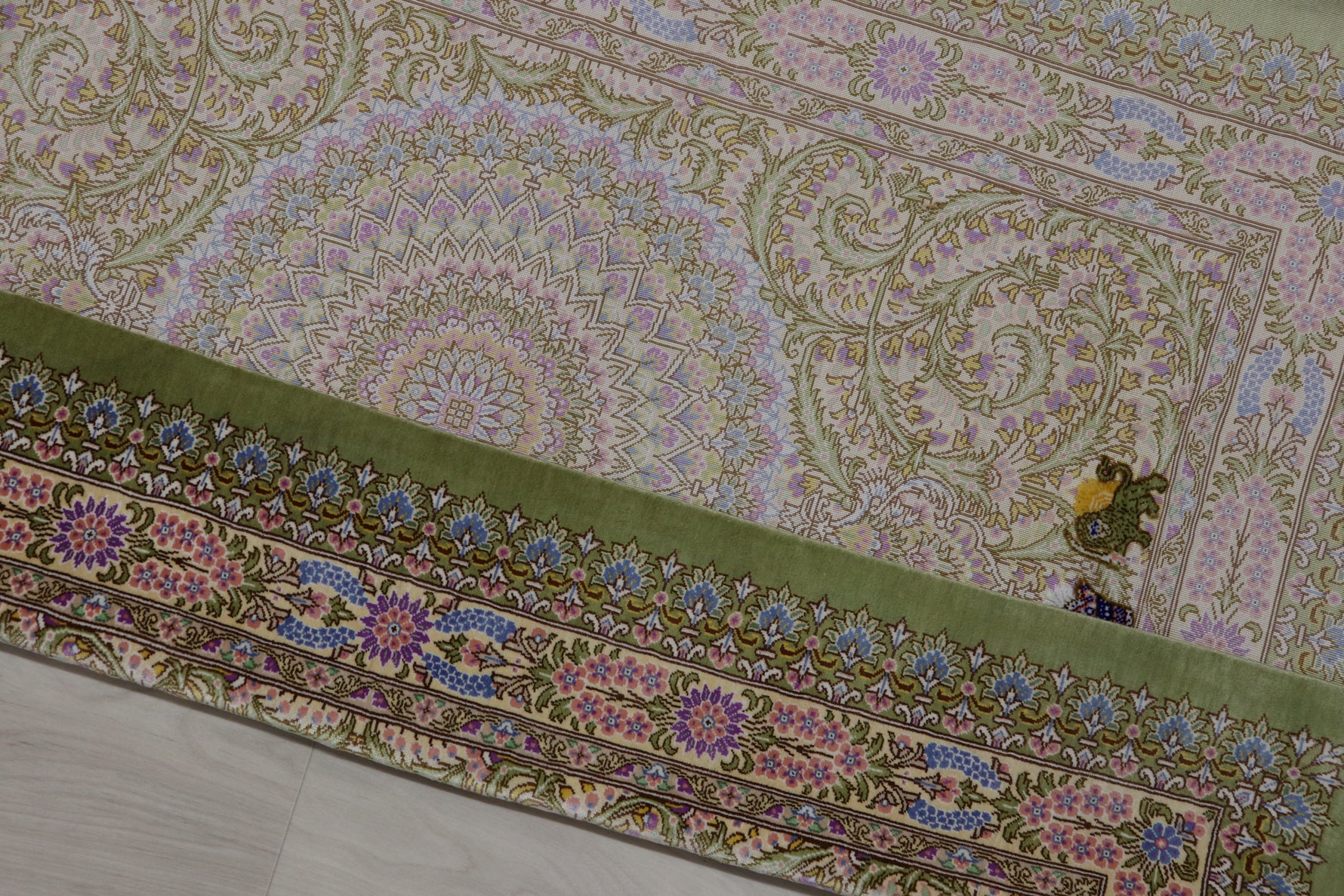 ペルシャ絨毯の最高峰・クム産シルクの中でも、名門「ジェッディ工房」が手掛けた、極めて優美で明るい色彩の作品です。