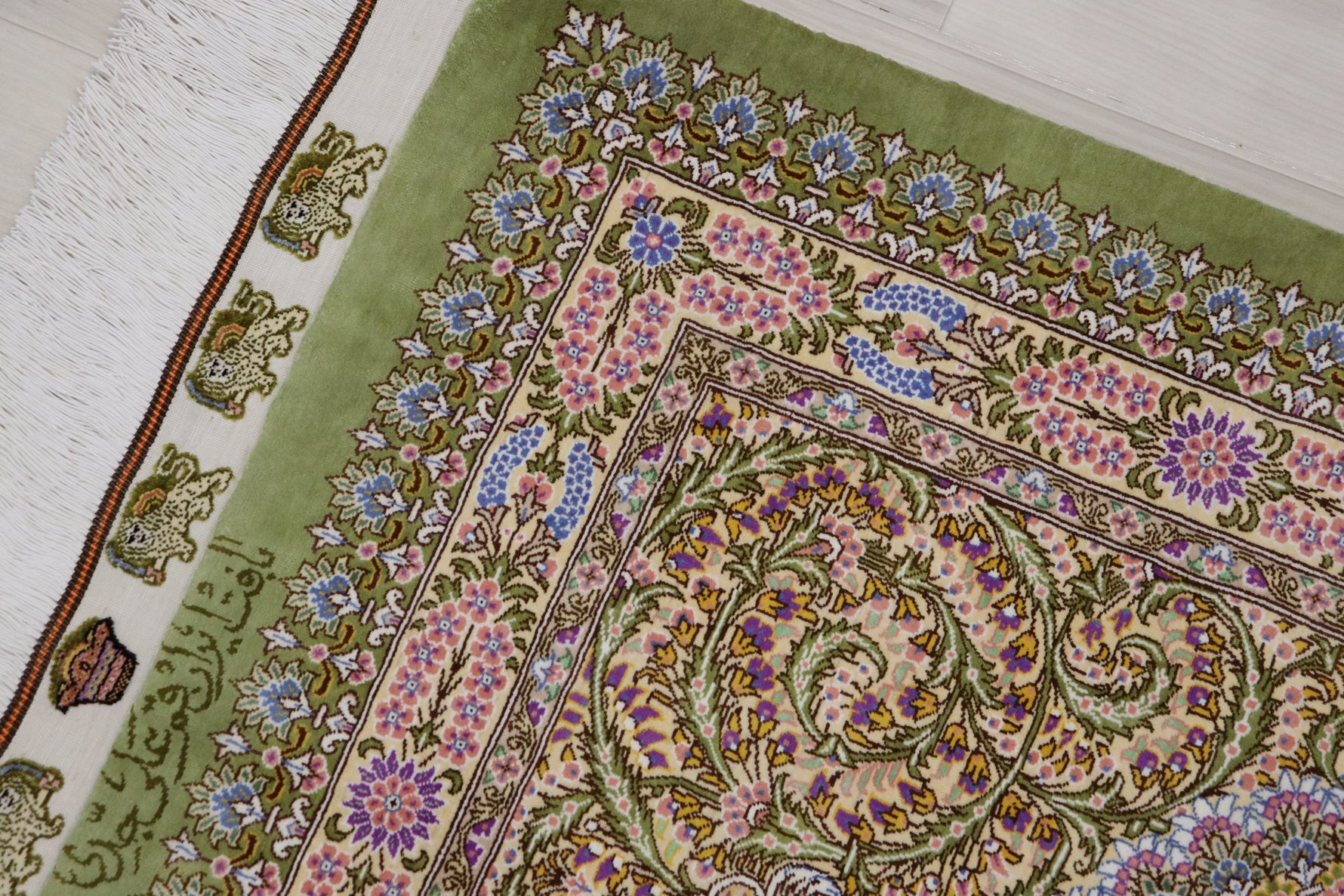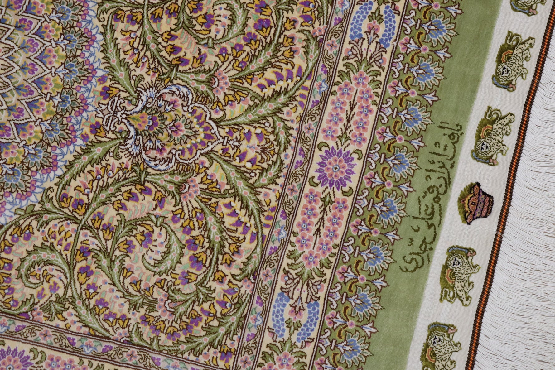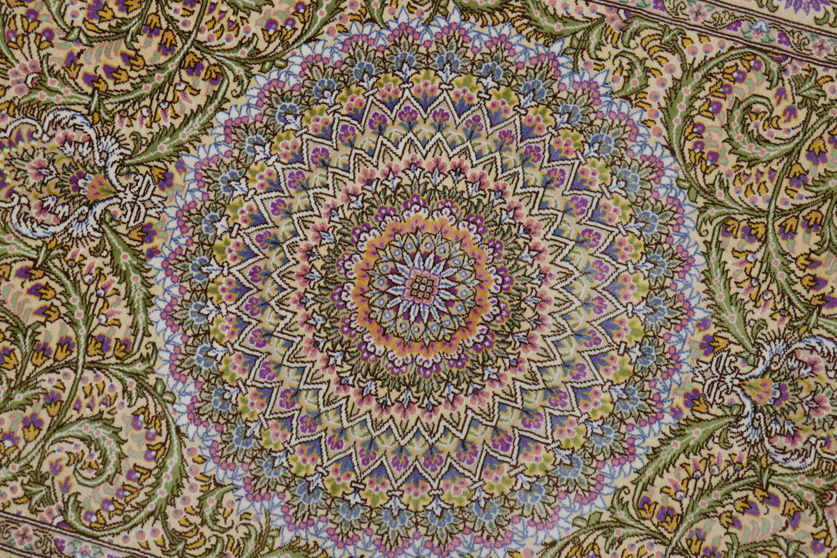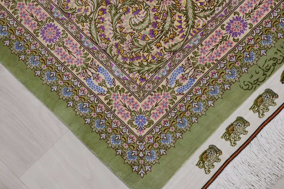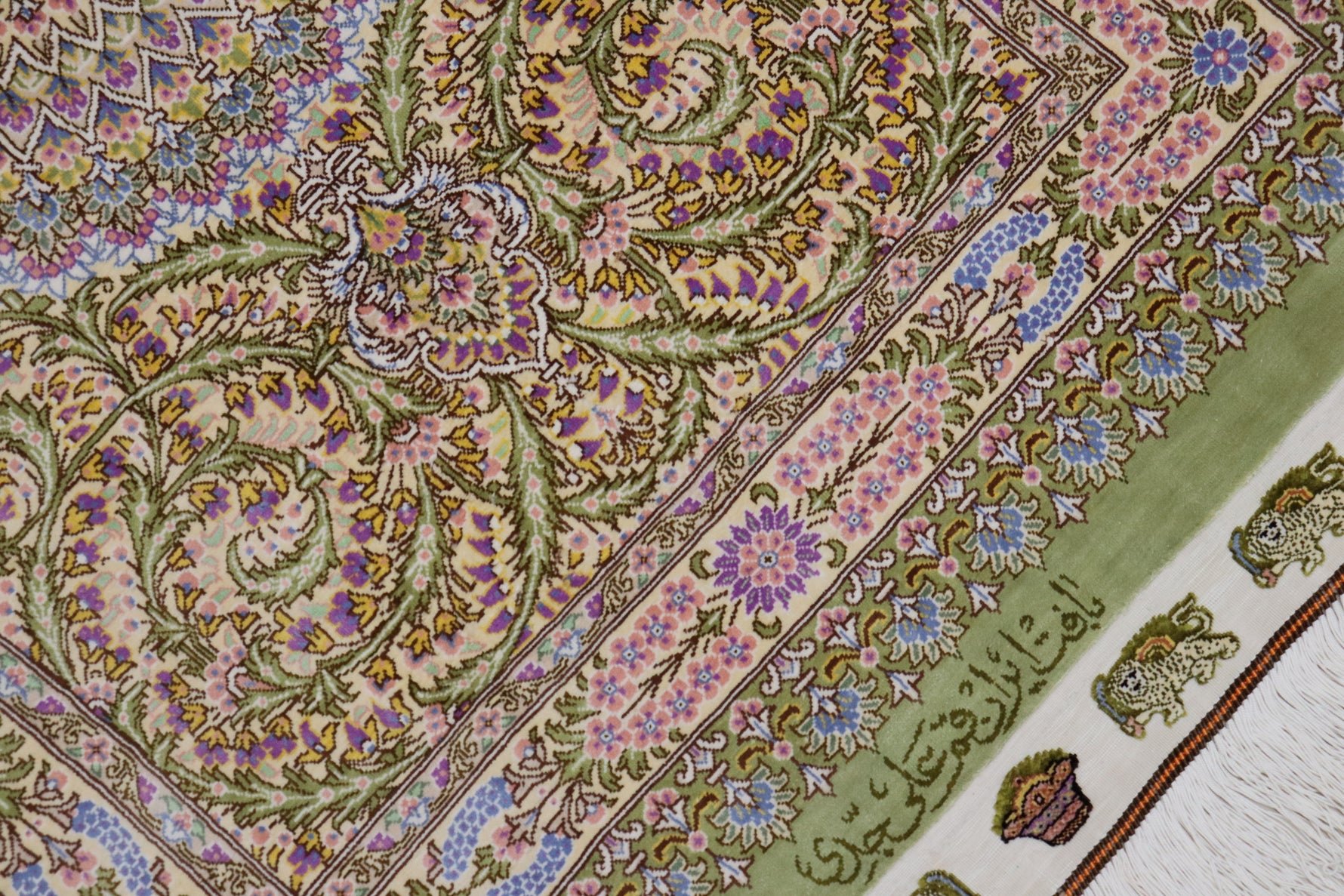 ペルシャ絨毯の最高峰・クム産シルクの中でも、名門「ジェッディ工房」が手掛けた、極めて優美で明るい色彩の作品です。