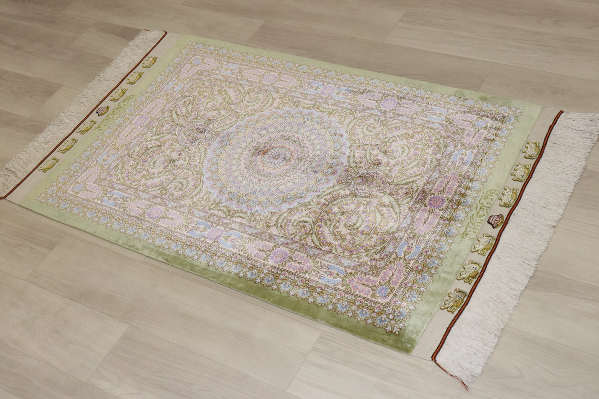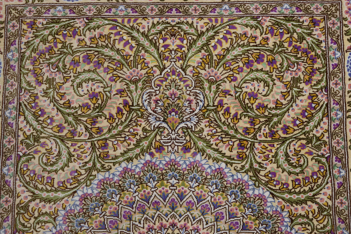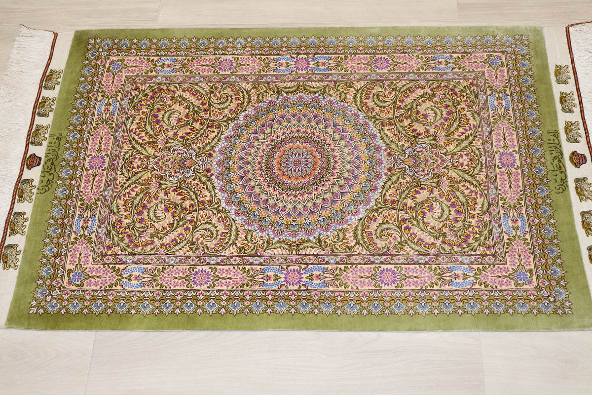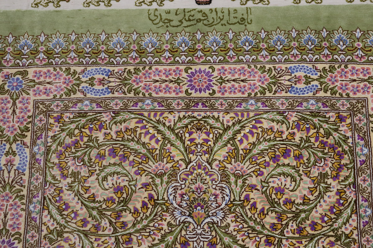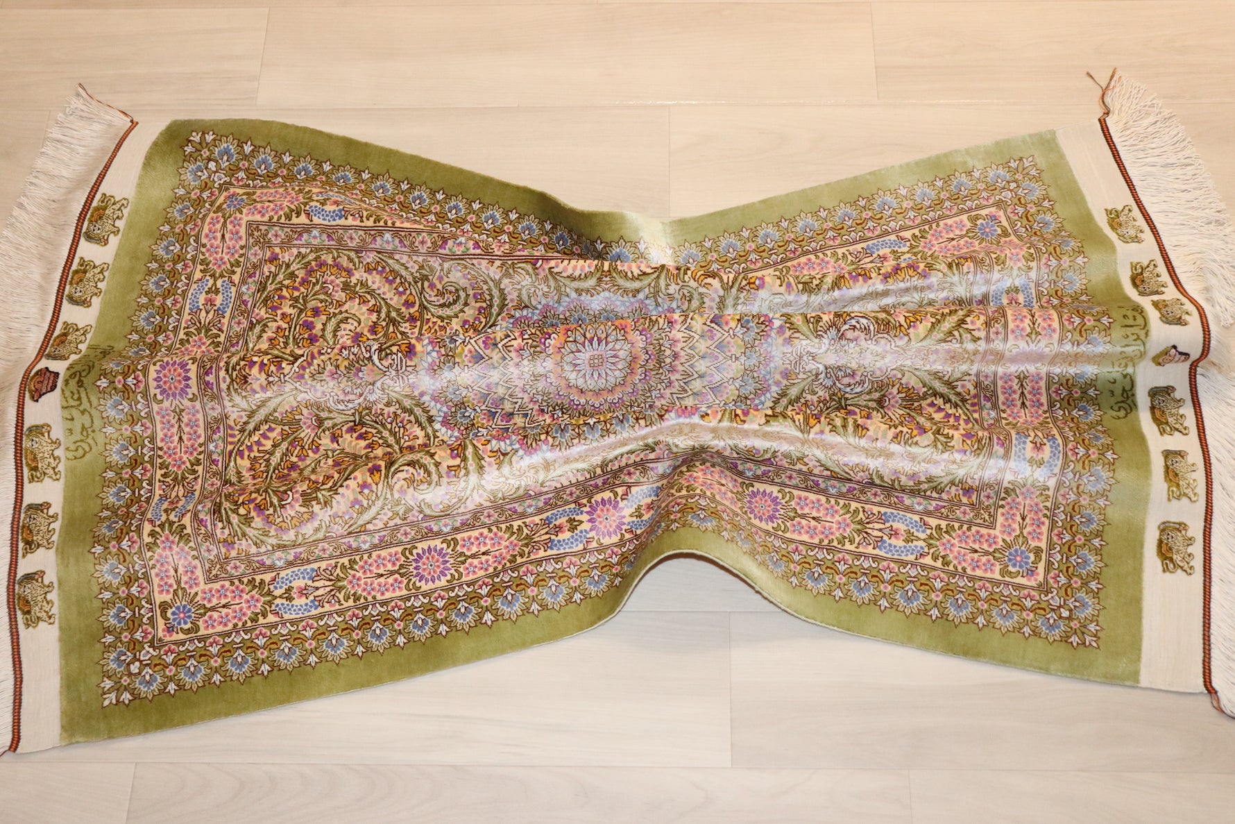 ペルシャ絨毯の最高峰・クム産シルクの中でも、名門「ジェッディ工房」が手掛けた、極めて優美で明るい色彩の作品です。