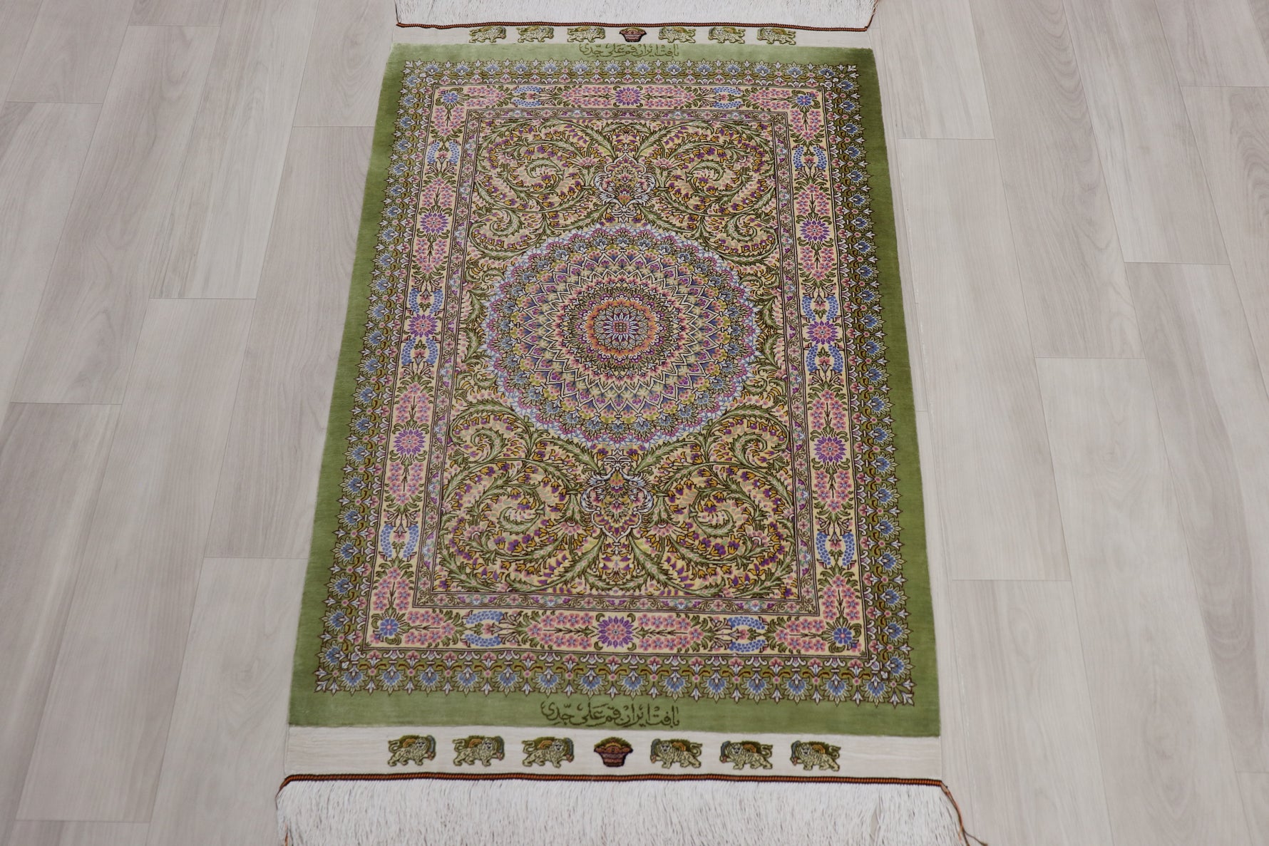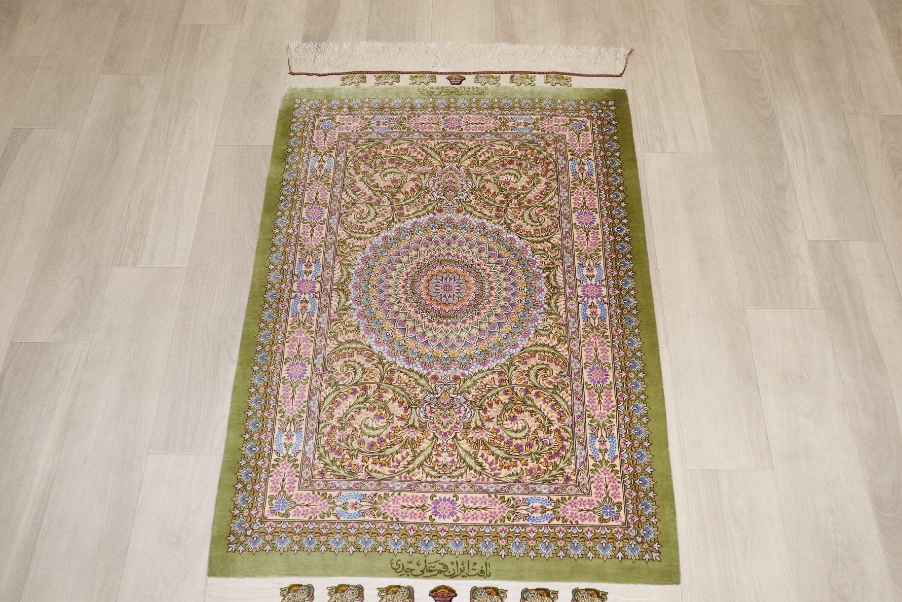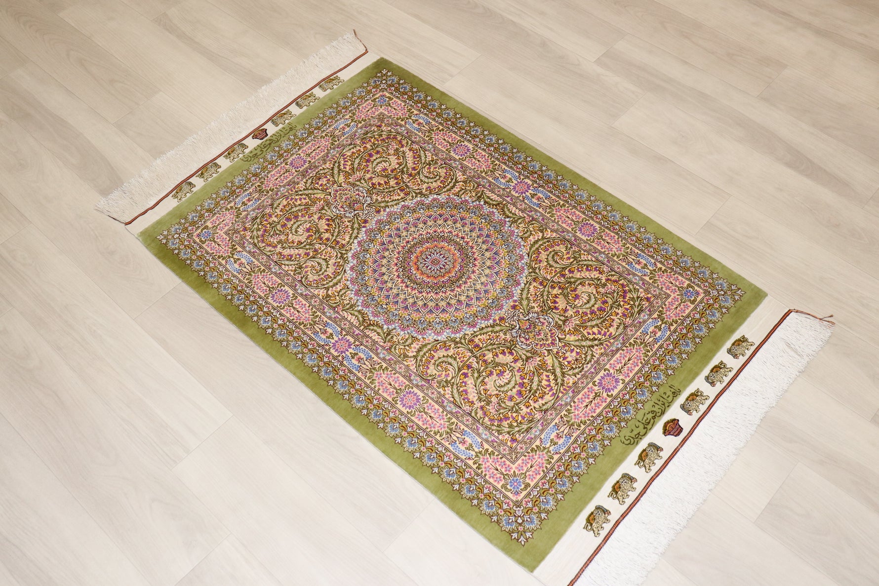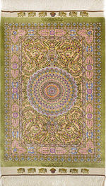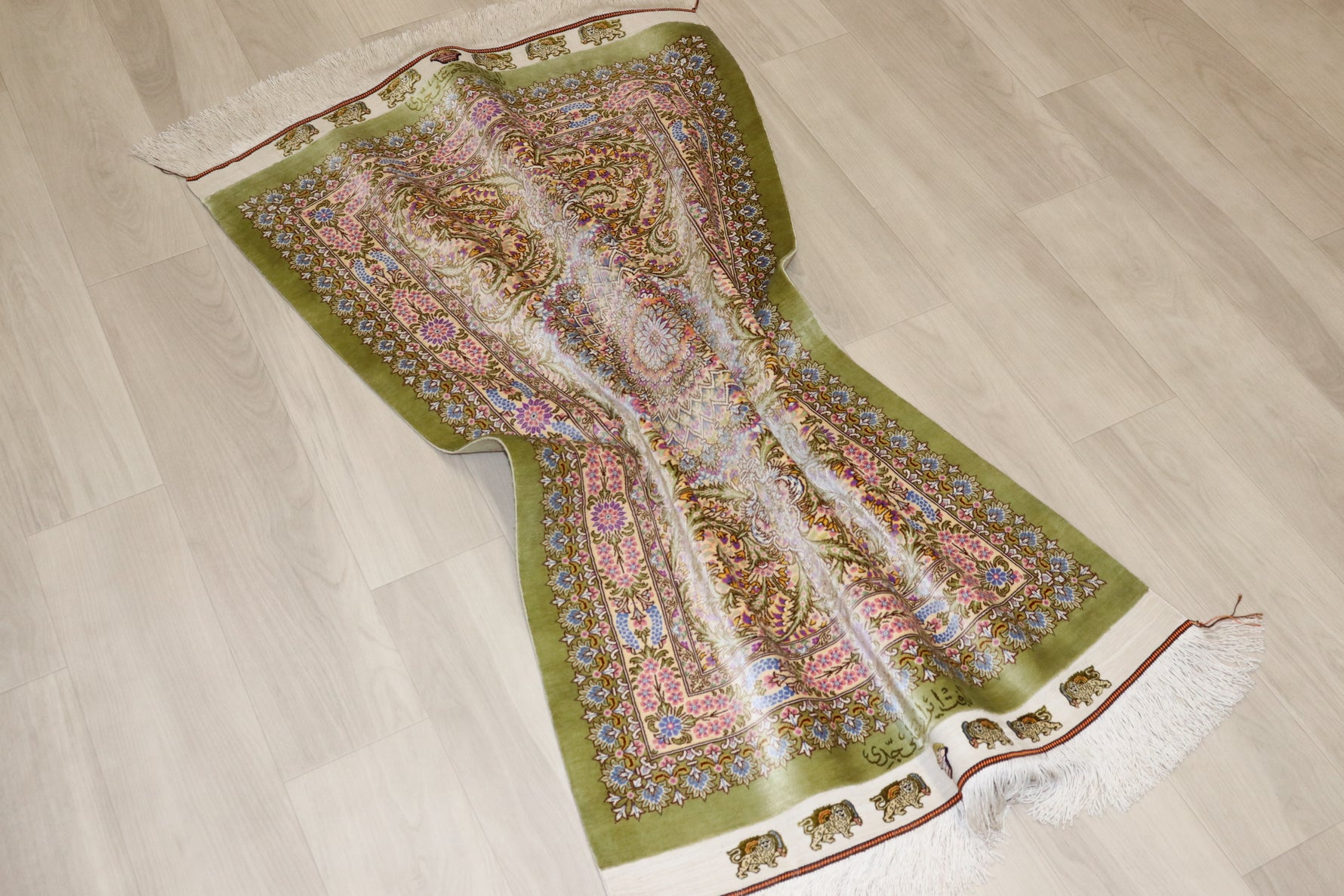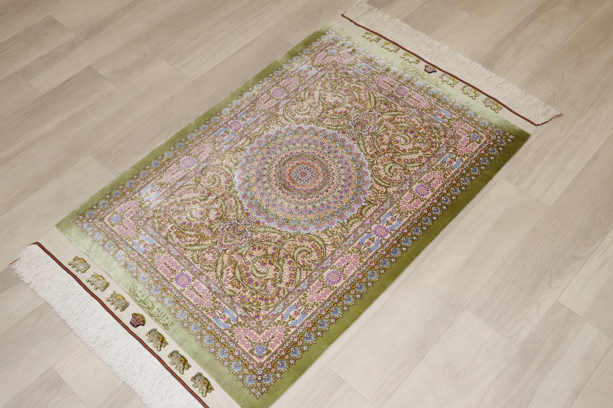 ペルシャ絨毯の最高峰・クム産シルクの中でも、名門「ジェッディ工房」が手掛けた、極めて優美で明るい色彩の作品です。