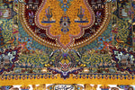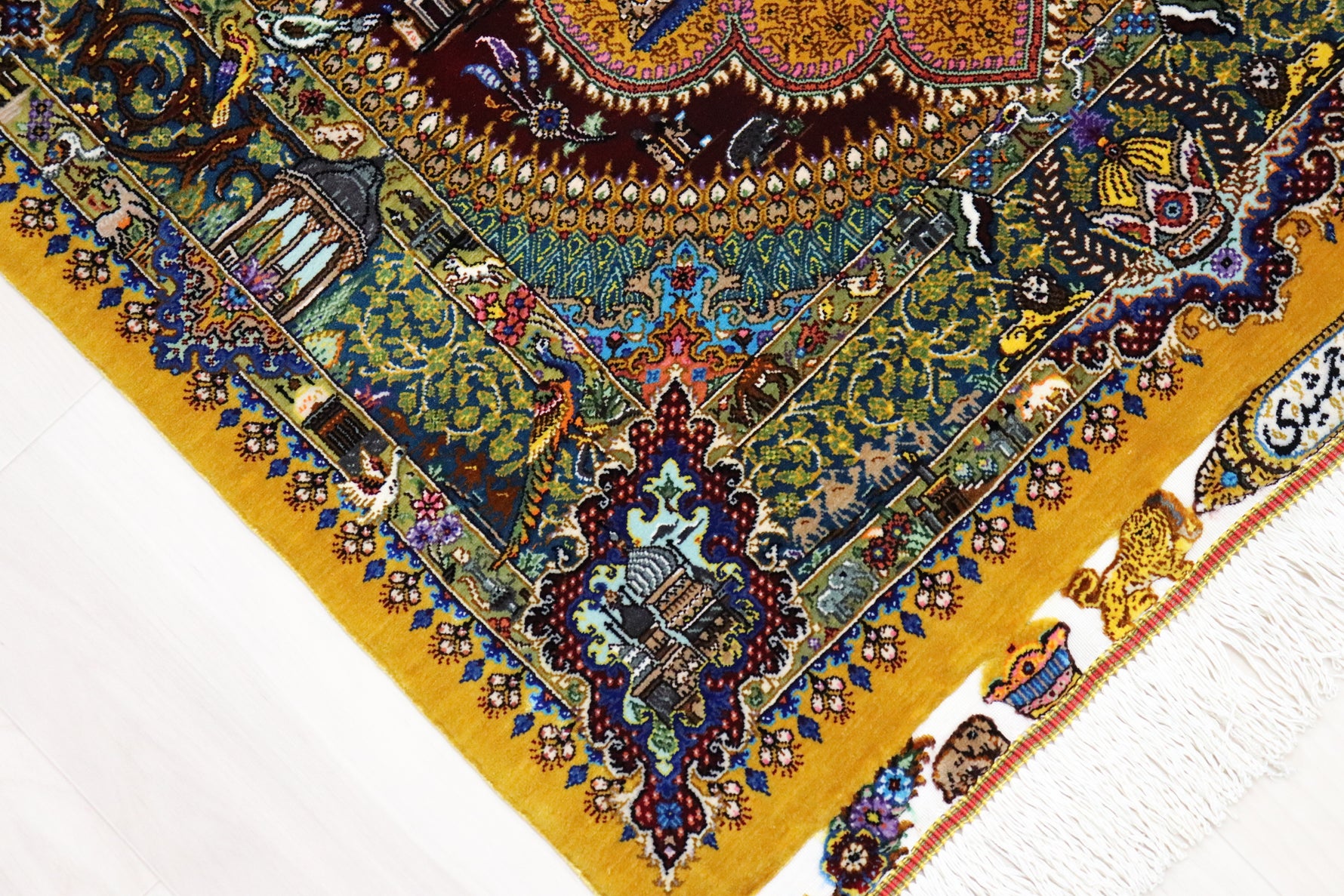 ■デザインの魅力:伝説を語る「古代文様」 この作品の最大の特徴は、ペルシャの古代遺跡やレリーフ(浮き彫り)を彷彿とさせる「古代文様」です。 ジャムシディ工房の代名詞である深く神秘的な「緑(ジャムシディ・グリーン)」と「黄金色」のフィールドには、単なる装飾ではなく、古代より神聖視されてきた鹿(ガゼル)や鳥などの動物たちが、威厳を持って描かれています。 それはまるで、かつての王朝時代の狩猟図や宮廷の庭園を眺めているかのよう。一枚の絨毯の中に、数千年にわたるペルシャ文化の美学とロマンが凝縮されています。