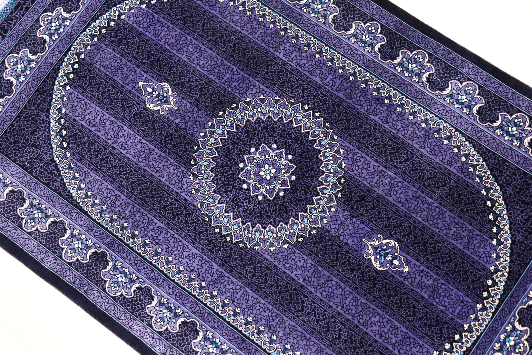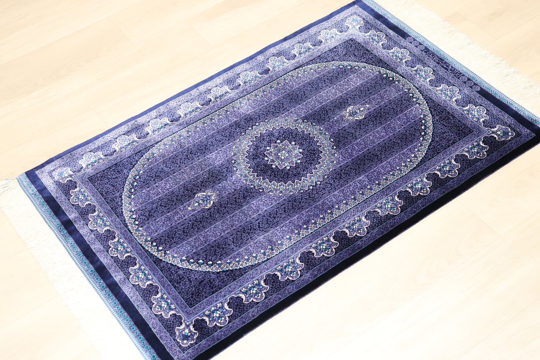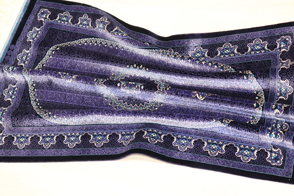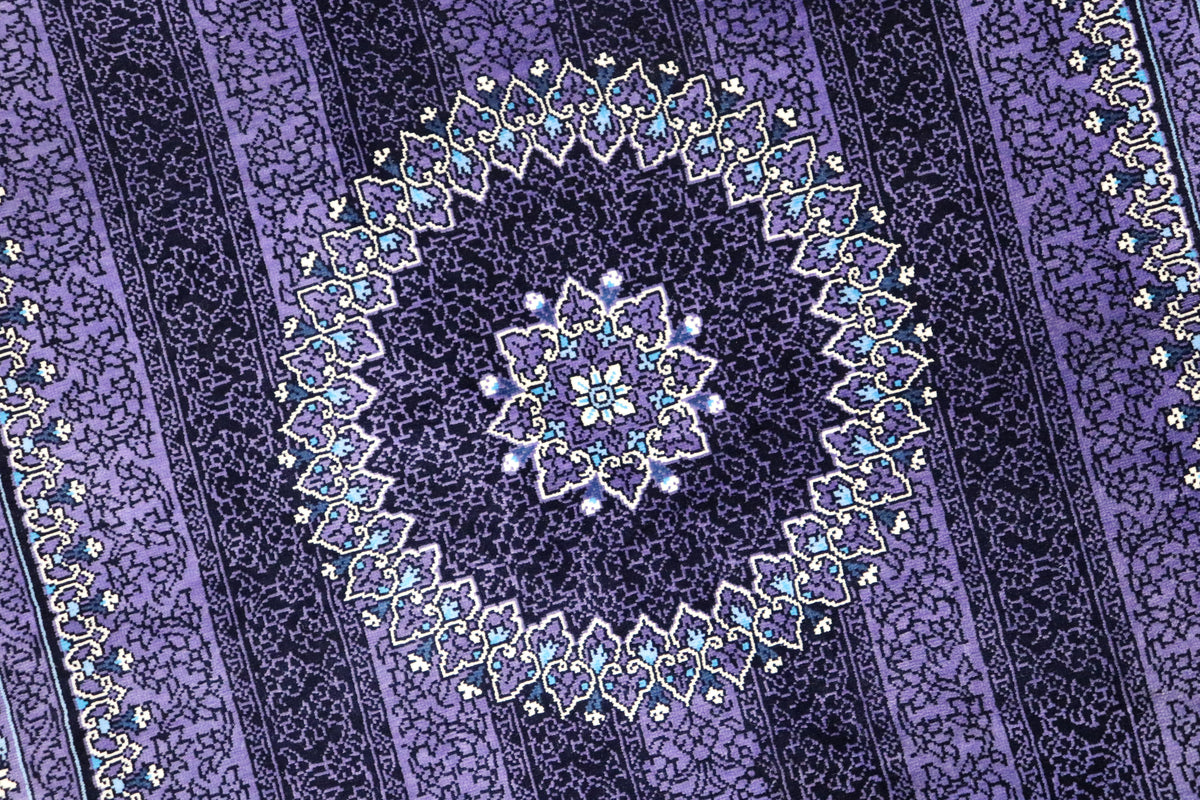■120万ノットの超高密度 1平方メートルあたり約120万ノットという最高級クラスの密度で織り上げられています。 約13ヶ月もの歳月をかけ、熟練の職人が指先で一つひとつ結び上げることで、紫の濃淡の中に描かれた微細な花々や唐草文様が、驚くほど鮮明に表現されています。