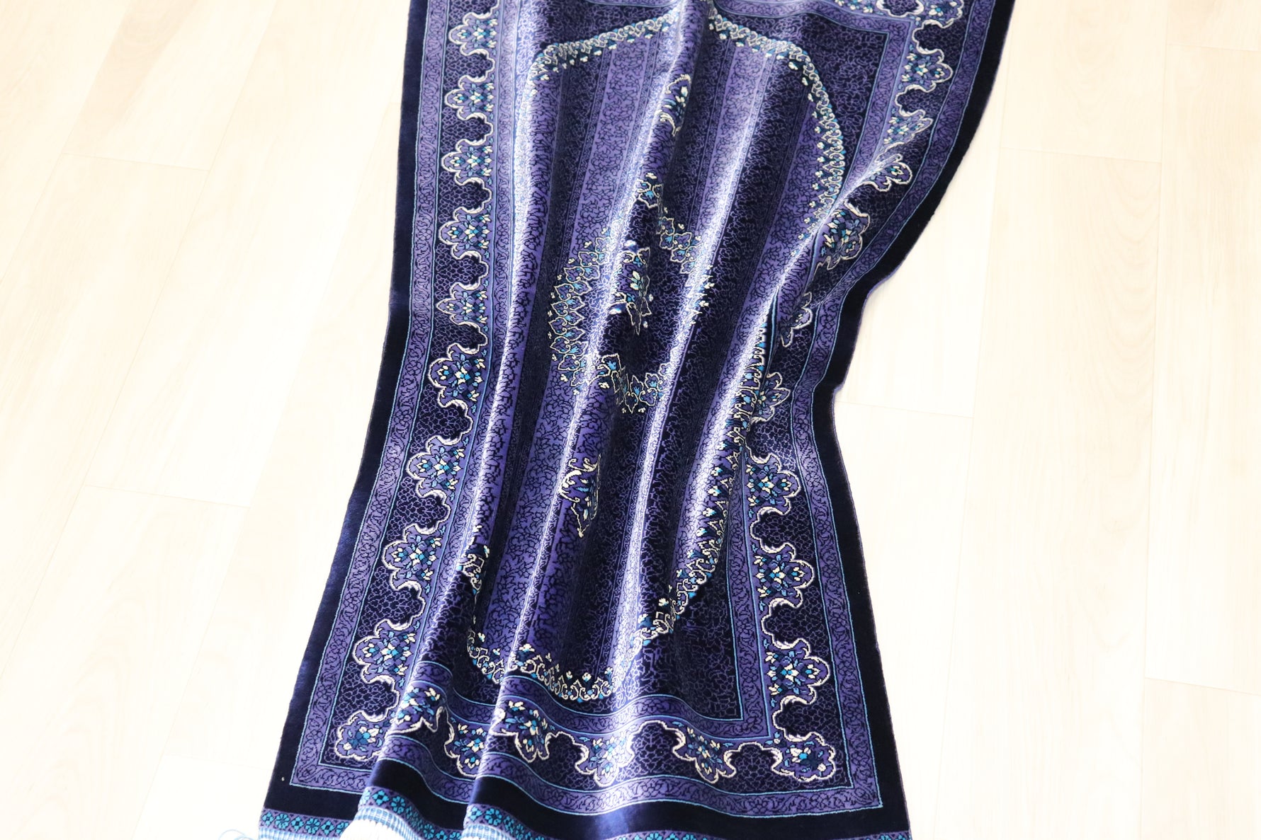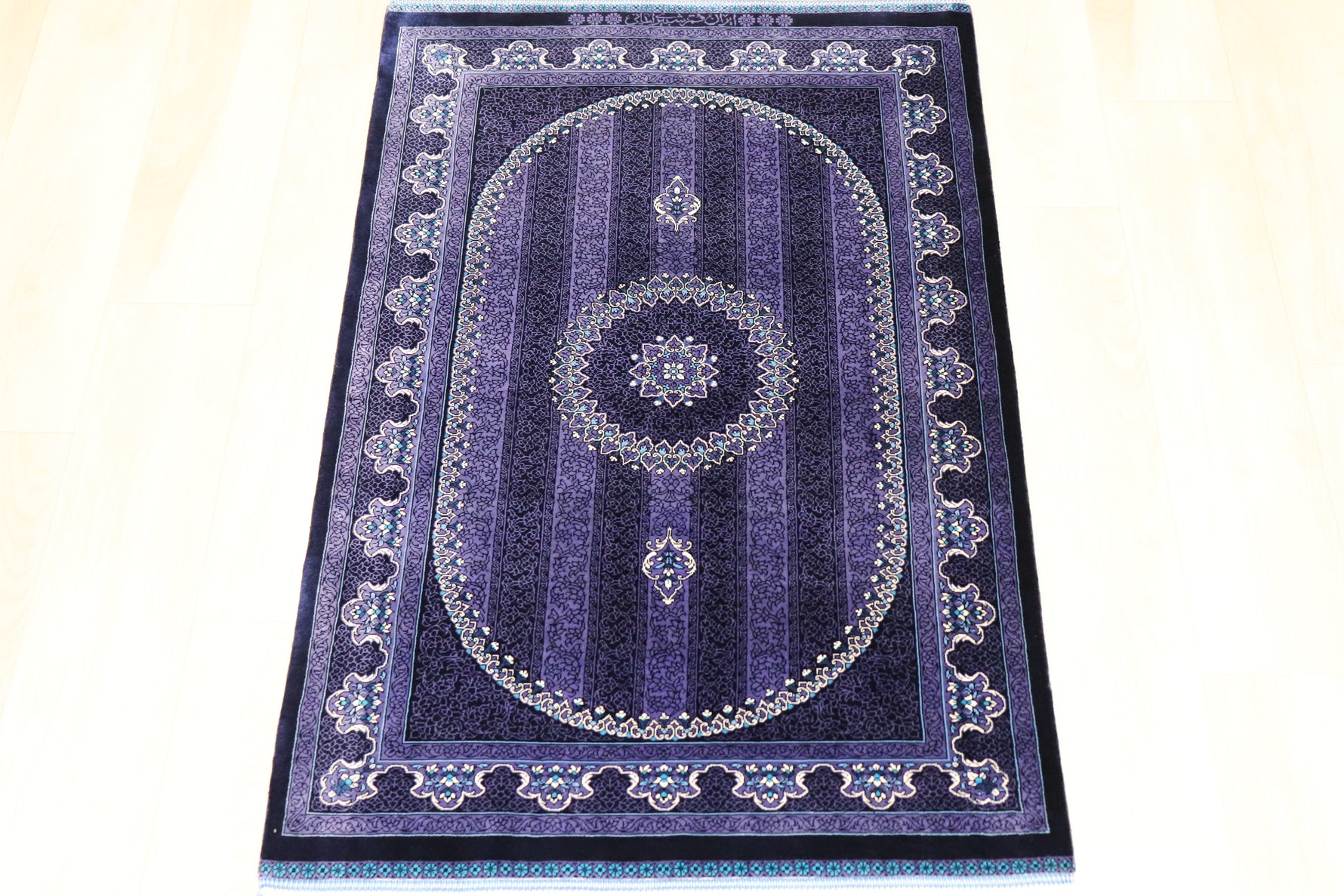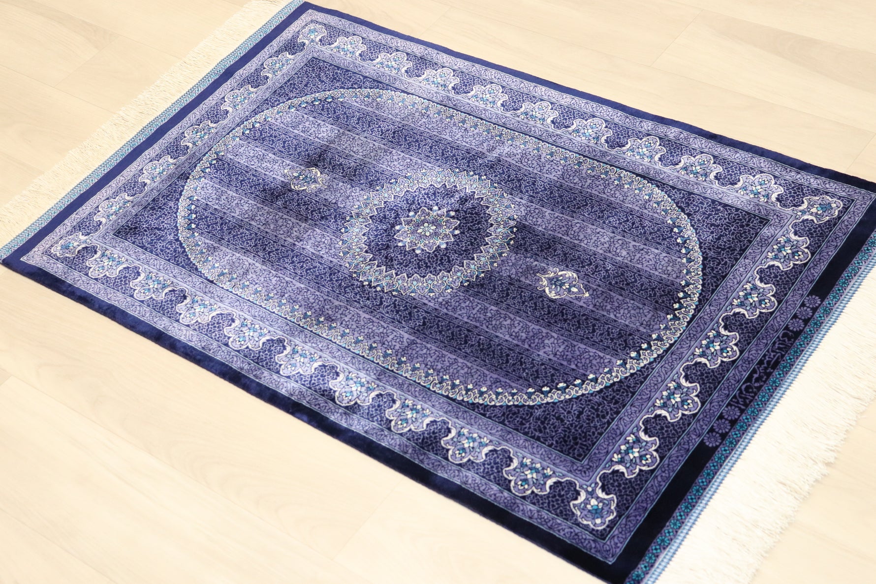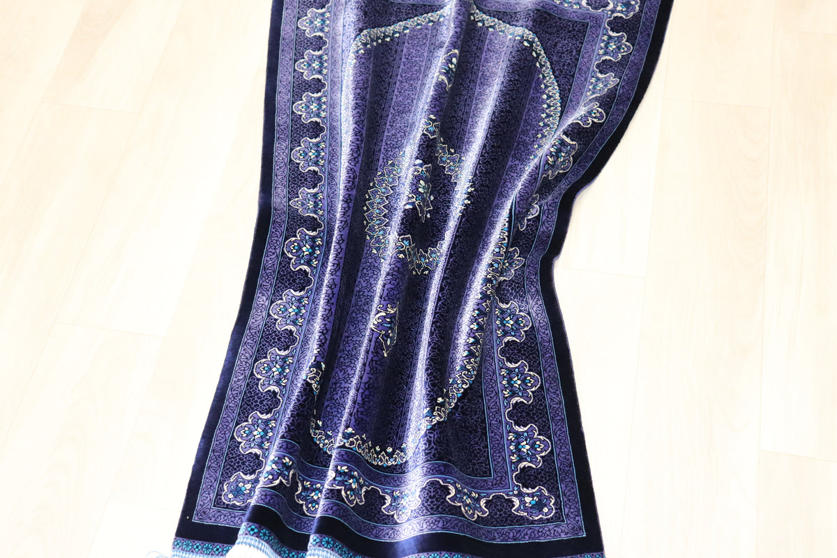 ■120万ノットの超高密度 1平方メートルあたり約120万ノットという最高級クラスの密度で織り上げられています。 約13ヶ月もの歳月をかけ、熟練の職人が指先で一つひとつ結び上げることで、紫の濃淡の中に描かれた微細な花々や唐草文様が、驚くほど鮮明に表現されています。